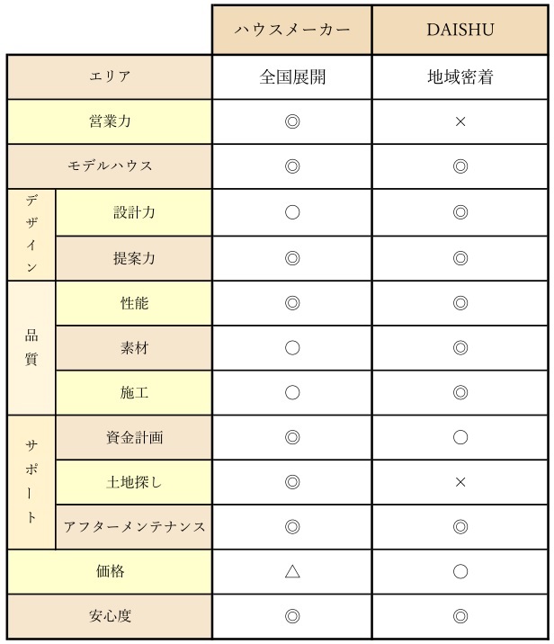 また、お施主様の声で多くいただいた、ハウスメーカーとDAISHUとの違いについて比較いたしました。 ご参考にしてみてください。