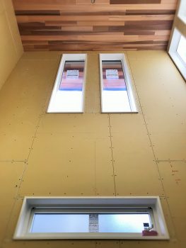 壁面にはこれから漆喰を施し、アクセントの壁には天井までエコカラットを貼ります。