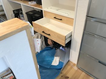 前日に大工さんが引出しを作成、お施主様宅では調整・取付です。