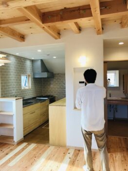 ワイルドな梁現しがカッコイイ!リビングをご案内中