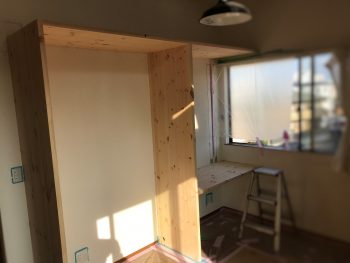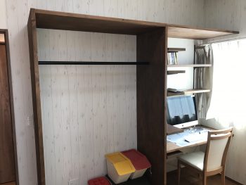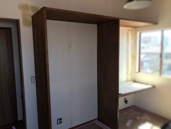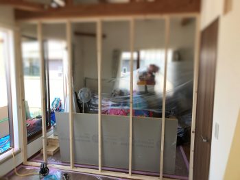 工事内容は「部屋の真ん中に間仕切りを設置し2つの部屋にする事」「収納棚・カウンターの設置」でした。