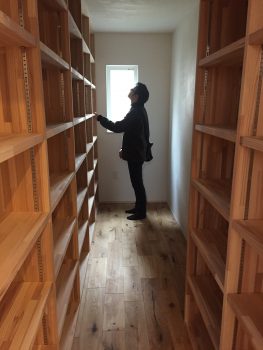 膨大な本を収納する造り付け本棚の前でたたずむE様。