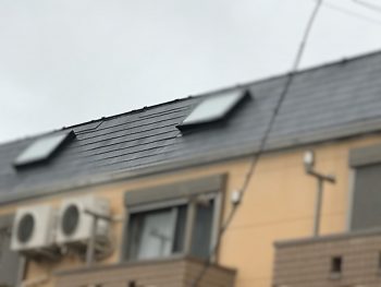 現場は住宅が密集している地域で確認が難い状況でしたが、確かに勾配違いの腰折れ箇所の屋根材が3枚ほど無くなっているのが確認できました。