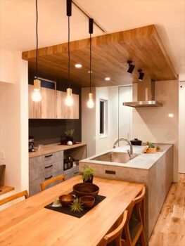 こだわりのキッチンハウスのキッチン。天井の木目やキッチンの背面壁の色も注目です。