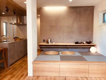 小上がりのワークスペースにはリビングの雑多なものがしまえる引き出し収納を設え、前面の壁は豊かな空間を演出する天然無機のシリカライムで仕上げました。