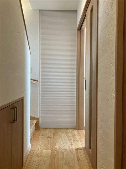 玄関からの冷気流入を防ぎ、廊下の体感温度を大きく改善するガイドレール付きハニカムスクリーン。