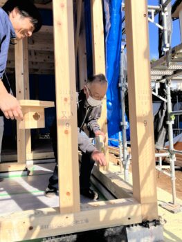 お施主様より「是非一緒に写真を」と、お声掛けいただき、建築士と大工さんが映る大変光栄な一枚です。