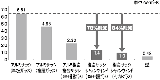 ある窓メーカーさんの製品比較ですが、一番右の「壁」の数値に注目して下さい。断熱を考えた壁なら更に良い数値になります。