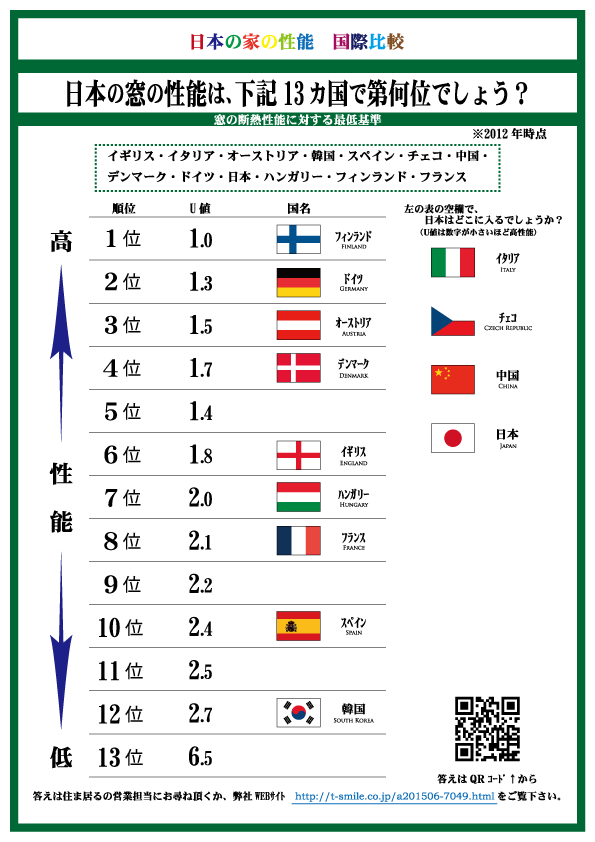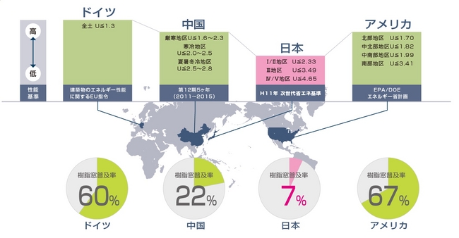 2015年には、ドイツがU値0.9以下、中国も2.0以下、韓国では推奨基準として1.6以下となっています。日本の推奨基準が4.07以下なので極めて低い。(Ⅳ地域東京・千葉・埼玉など/アルミ+Low-eガラス)