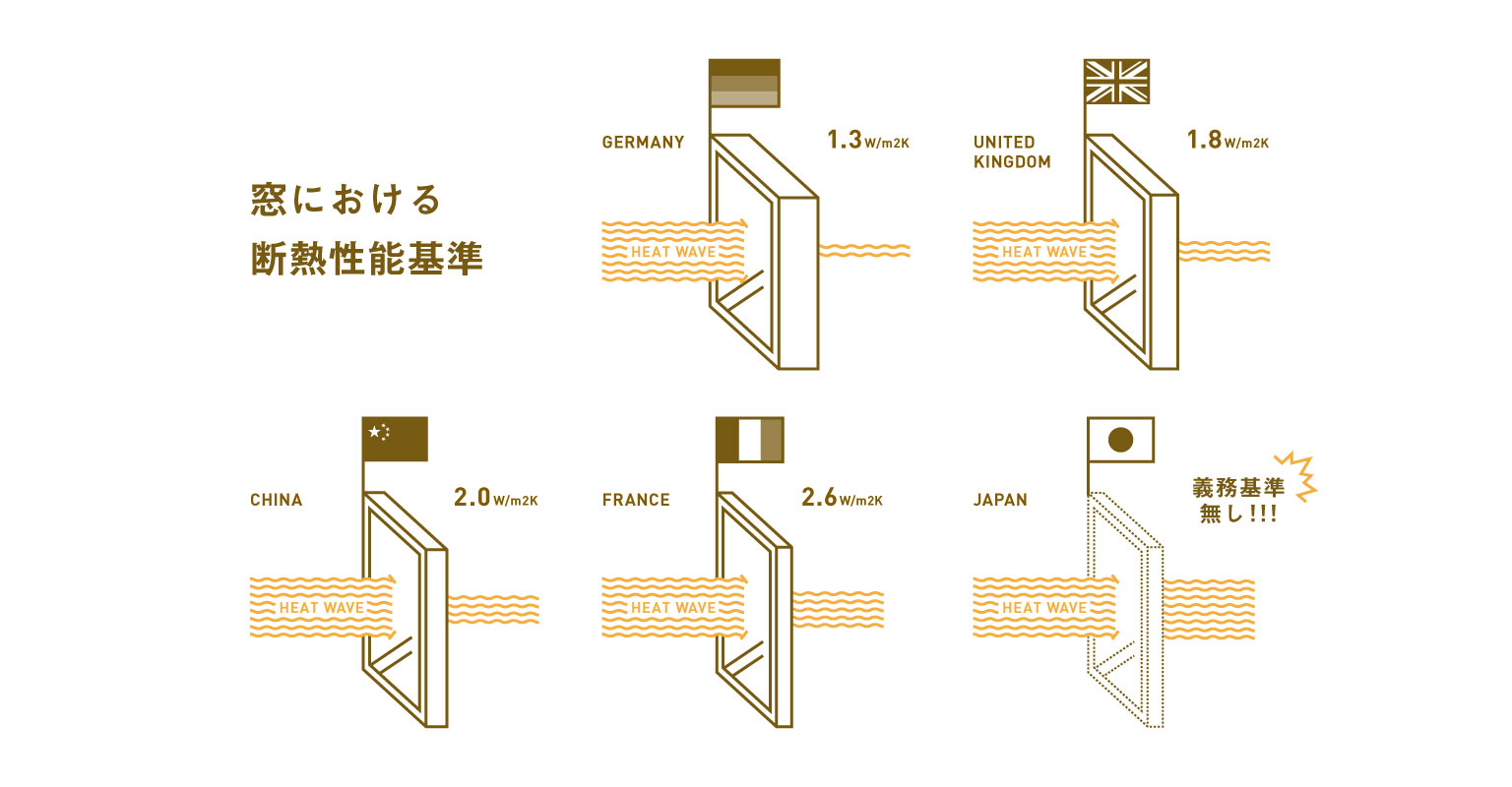 日本では、窓の断熱性能の義務基準がありません。おとなり中国をはじめ先進国ではしっかりと基準があります。(参考:暑さの7割寒さの6割は窓が原因なのに、日本の窓は中国の最低基準以下 という窓後進国です!)