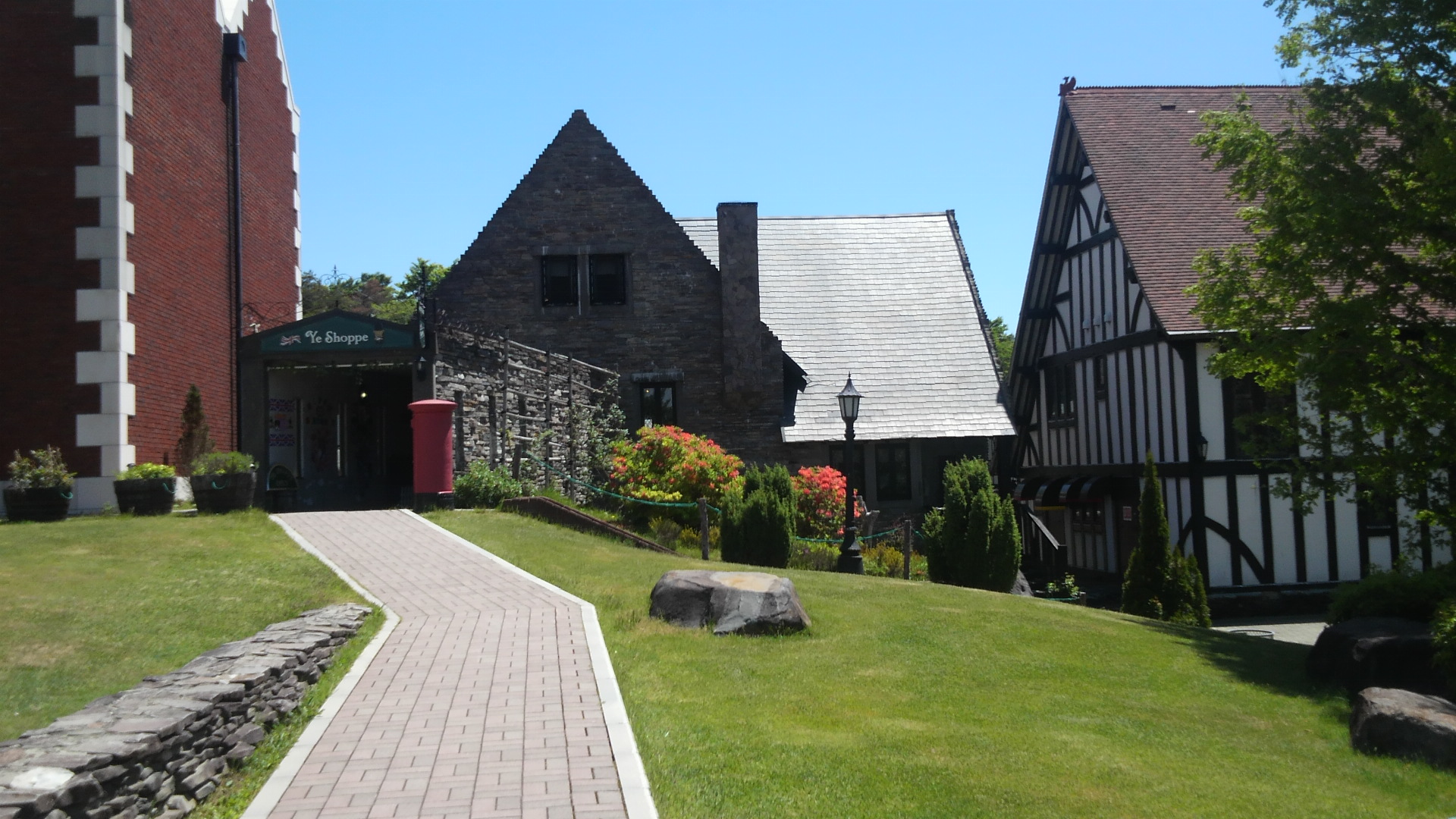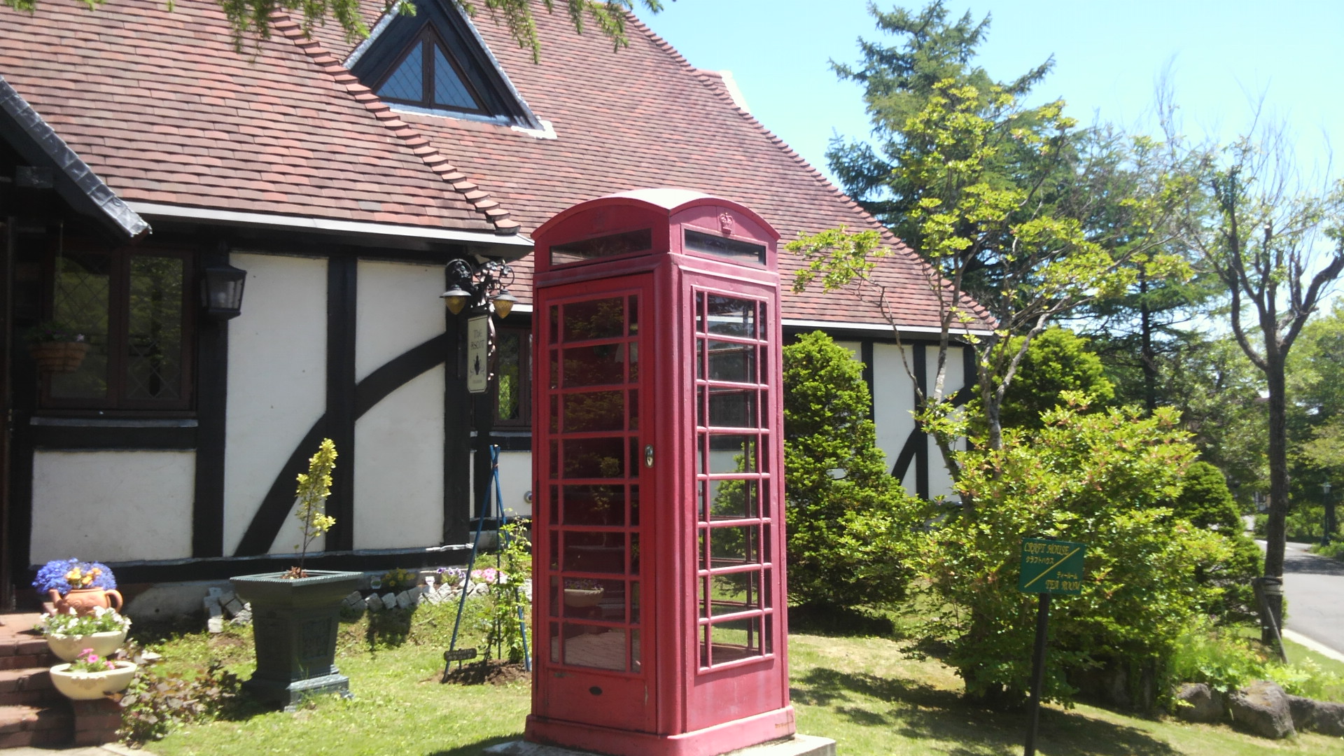 かわいい、英国風のポストがあるおみやげ屋さんがあったり、電話ボックスも英国風で
