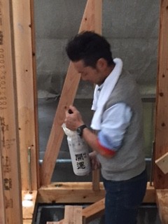 建物の四隅の柱と土台を塩、米、酒で清めます。