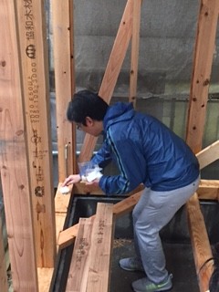建物の四隅の柱と土台を塩、米、酒で清めます。