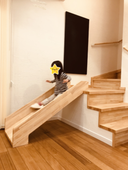 【造作すべり台はお引き渡し当日もとても楽しそうに何度もすべってくれました 背後には黒板も】
