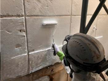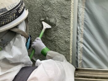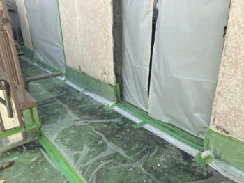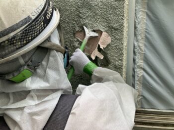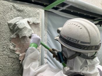 乾燥した塗装材を撤去する為に何も処置せずに剥がす、削り取ろうとすると粉塵が舞い飛散するので石綿含有建材専用の剥離剤を塗布した後(24時間経過させる)に飛散対応の上、剥がし取ります。