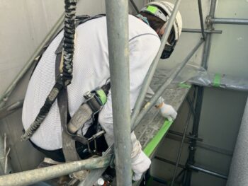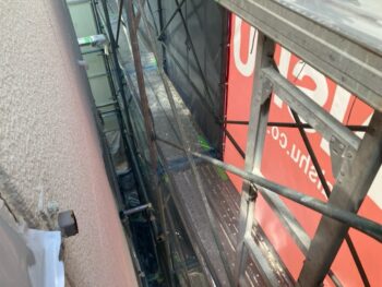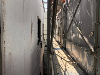 今回、ご紹介する内容はレベル3扱いの建材(外壁面に吹付け塗装した塗装材に石綿が含有)ではあるのですが、飛散性としては作業の進め方によっては高まる為、レベル1の作業要領を活用しながら進めました。