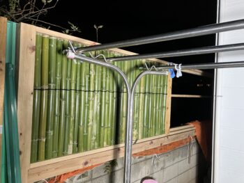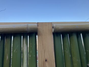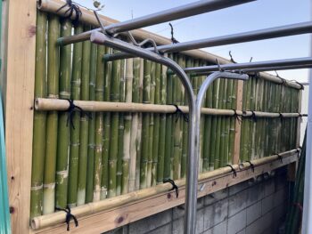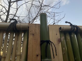 ここまでの作業が済むと何となく見た目はフェンスが完成したかのように見えるのですが、高さ90cm程の格子となる竹の中央部のみ、結んで並べていくだけで構成された状態なので強風が吹けばカタカタ揺れてしまう不安定な状態。