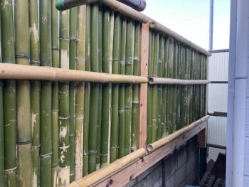 昨年末のブログでは、フェンスに使用する材料の「竹」が揃い、大詰めとなる格子の建込作業に入ったところで終わっています。