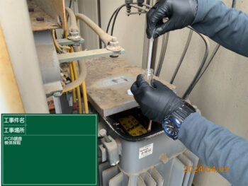 該当する頃に建てられた建物にキュービクルが設置されていた場合、変圧器やコンデンサー内にある絶縁油を試料として採取し、こちらも分析調査に出してPCB含有を確認します。