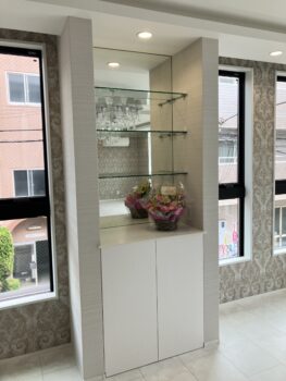 造作建具の上に強化フロートガラスで固定棚を施工しました。
