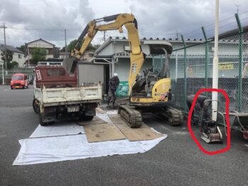 この砕石は運搬車両から荷降ろしした後、一定の高さまで敷き均してから転圧(プレートコンパクターという専用機器で振動を加えて締固めます。写真3の赤丸した機器)を行い路盤を整えます。