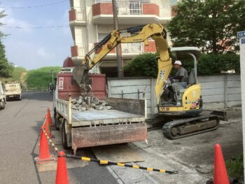 まずは既存路盤のコンクリートや砂利を重機にて壊し、整地と共に土の路盤を造っていきます。