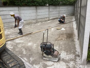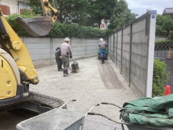 土の路盤整地後、砕石を敷き込み振動ローラーやプレートという機器を使って路盤を転圧しながら締め固めていきます。
