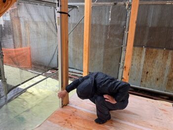 下の写真は柱の鉛直精度を確認して調整を行っているところです。