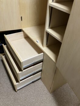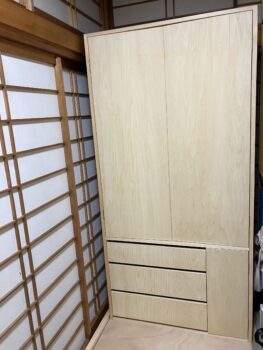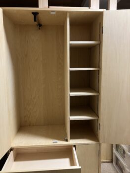 最も時間がかかった引き出しも何とか正常に嵌り、ハンガー脇には小物を置くような棚スペース、引き出し脇に小扉を設けてみました。