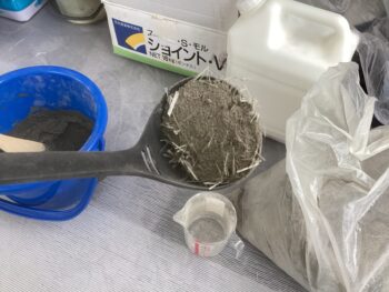 この樹脂モルタルは、今回のような建物の揺れ等で生じたひび割れ部で今後もひび割れが再発してしまいそうで悩んだ時に使用する材料です。