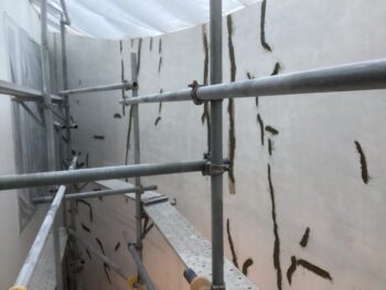 建物自体に加わった揺れやモルタル自体の乾燥収縮も有ってか、壁面にはひび割れ部が見受けられる状態です。