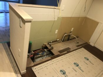 ②食器棚の設置スペースを確保するため、キッチン間仕切り壁位置の変更と水廻り対応フロアの上張り
