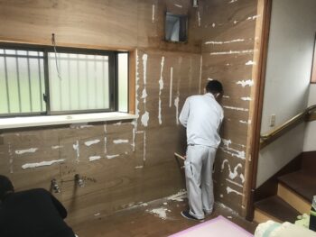 写真は1日目、キッチン解体キッチンパネル剥がし作業の様子です。