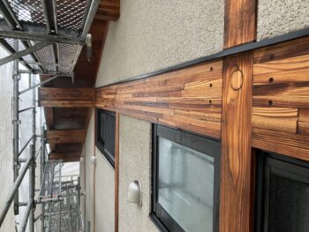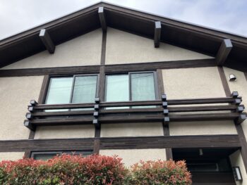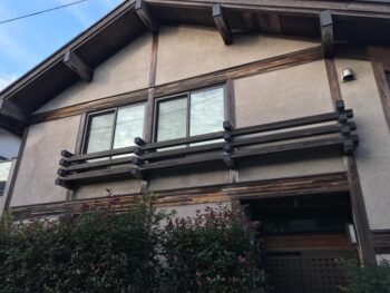 現しになっている木部が、排気ガスなどの汚れで黒くなっていました。外壁はそとん壁という高耐久性の塗壁材を採用しており、木部塗装の前に外部全体の洗浄工事をしました。外壁の汚れが目立つところはサポートジアーナ(洗浄剤)で処理しています。