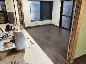 新築工事現場同様、床組施工~床下断熱材を敷き込み~下地合板張り~フロア張りを進めました。