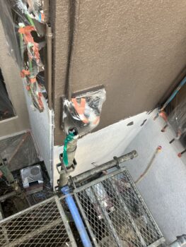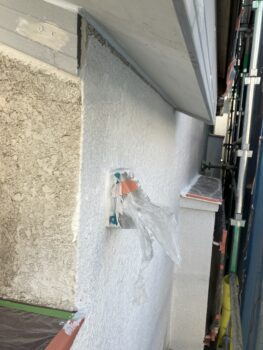 高圧洗浄を行い、養生後、外壁面の下塗りを行います。