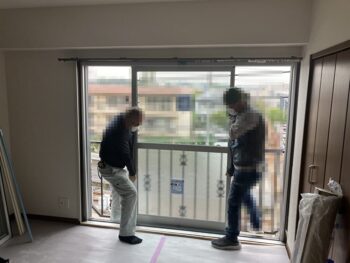 ②施工周辺の養生を行い、既存ガラス窓を取り外します。