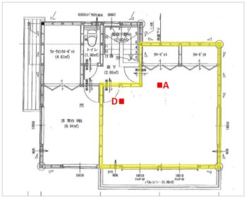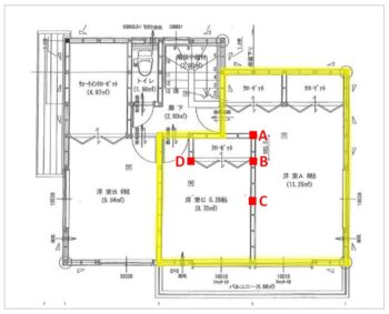 「Aの柱は抜く事はできませんが、壁とクローゼットは小屋組の梁補強をする事で解体が可能です。Dの柱は抜けると思いますが小屋組を確認しないと判断できません。その他フローリングを現状の床に上張りする事により、廊下と段差が生じてしまいます。」