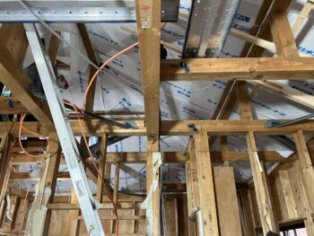 新築工事現場と違い、既存の天井野縁組カットや必要な間柱欠きこみを行わなければならず想定以上に大変でした。断熱改修になります。