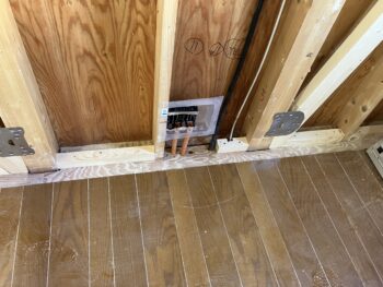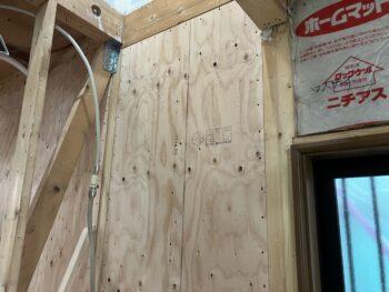 発注者様手配の構造設計業者からの補強図面に基づき筋交い入れ、耐力壁面材張り(ベニヤ張り)を行いました。