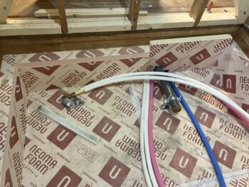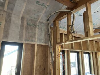 2階の天井壁断熱は注文住宅でもご提案しているセルロースファイバー断熱を採用していただきました。UBの基礎面断熱施工です。