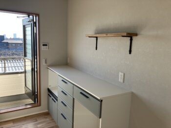 カップボード上の固定棚はお客様からのご支給品(※支給品とは、工事において施主(建築主)が直接購入し、施工に使用する品物を指します)