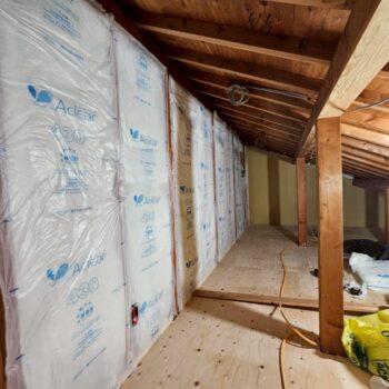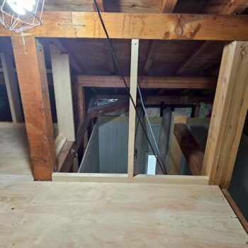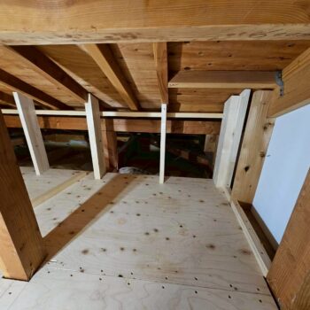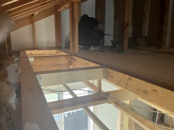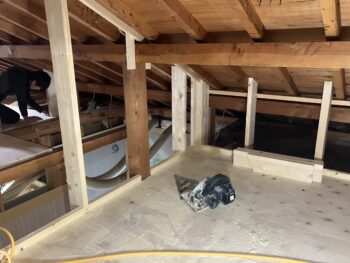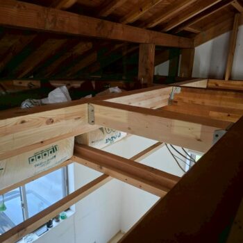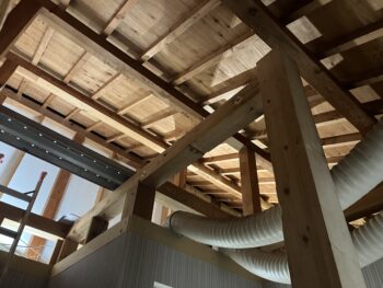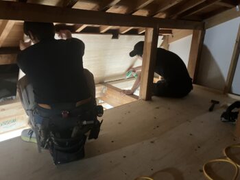 床組、下地合板張りが完了したら2階洋室の造作作業とロフト壁下地断熱材入れ天井組の二手に分かれて非常に効率の良い進め方でした。