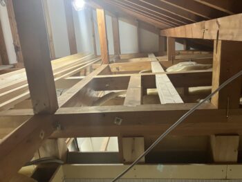 新築現場では行いませんが既存の梁がやはり若干のねじれ反りが見受けられ、後々の床なり等が心配だったため梁と床合板にボンド接着を指示しました。