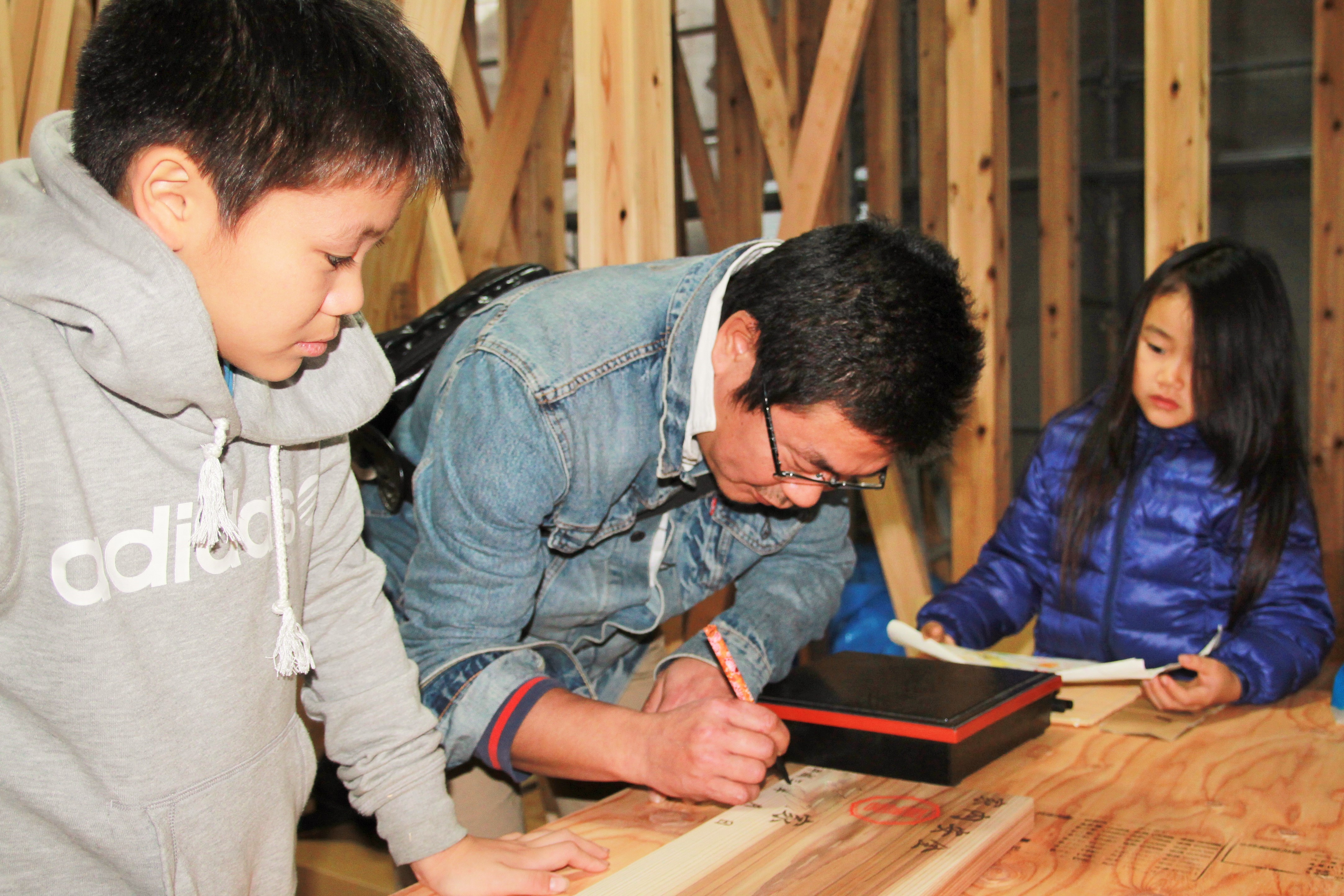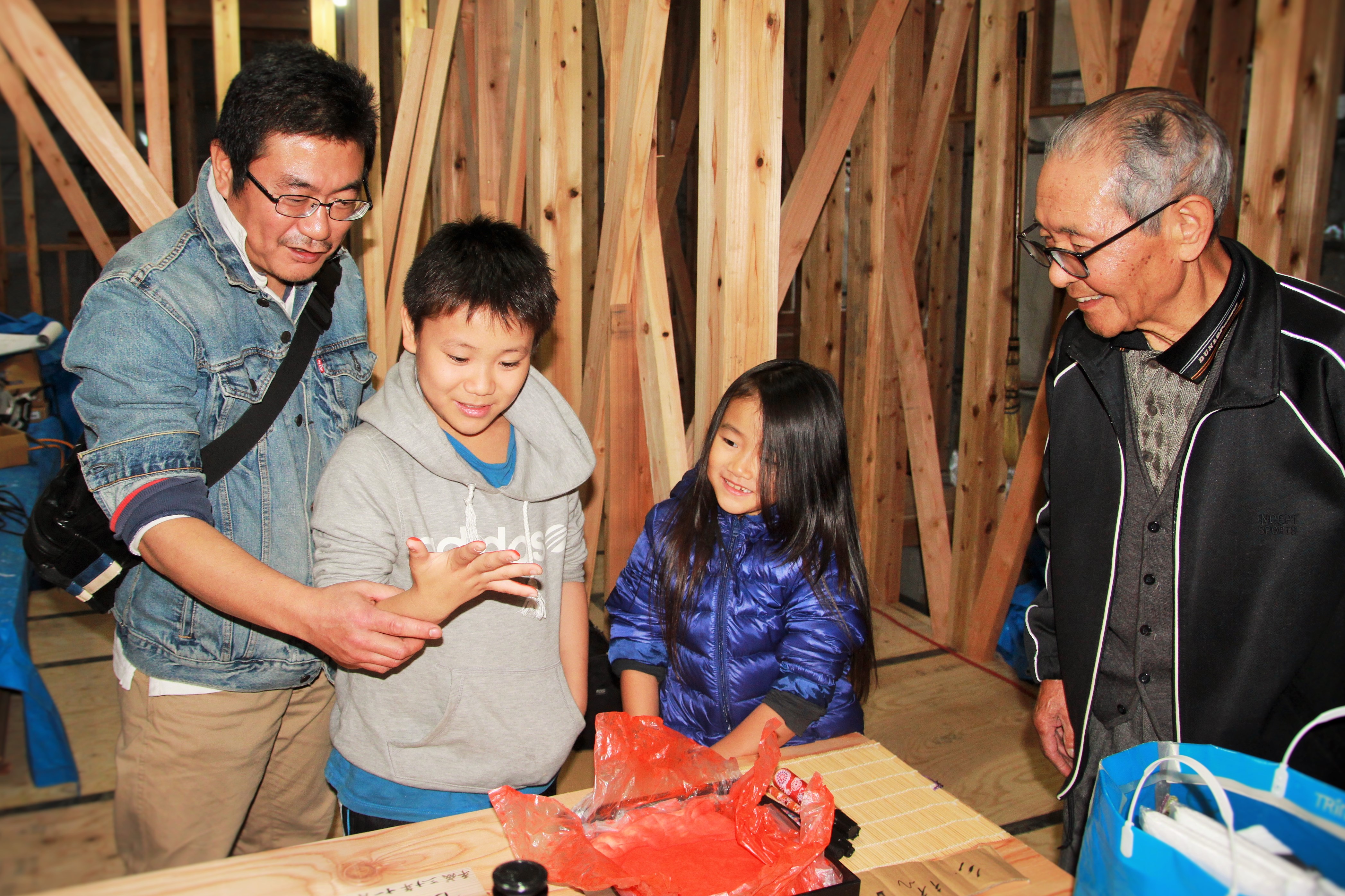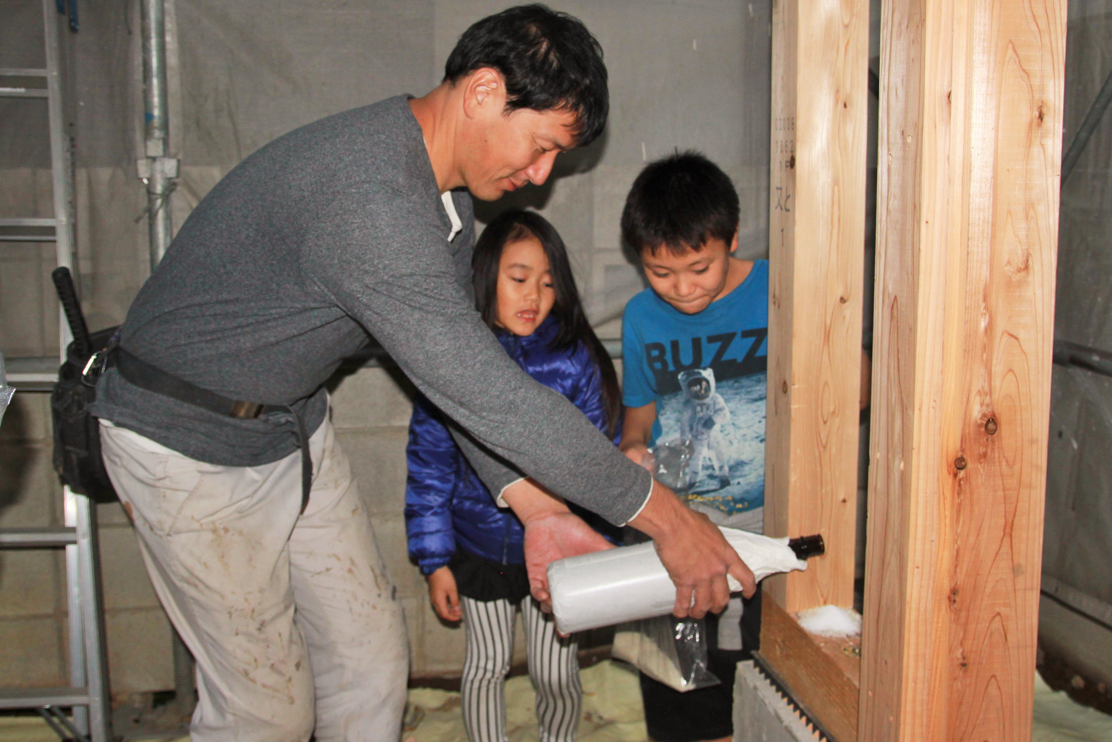 兄弟仲良く、お塩とお米を盛った後、棟梁がお酒で清めます。初めての体験に興味津々。 -