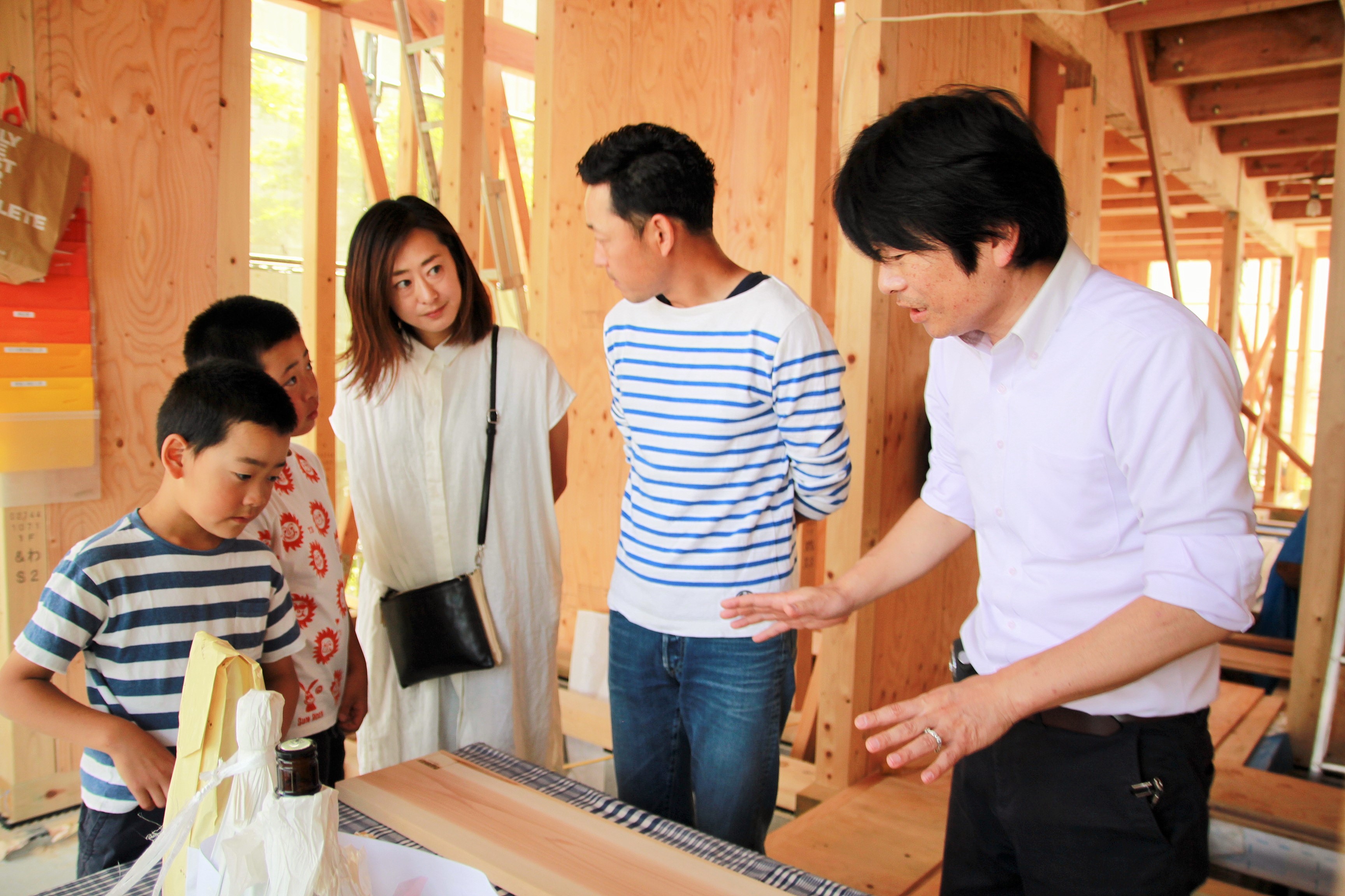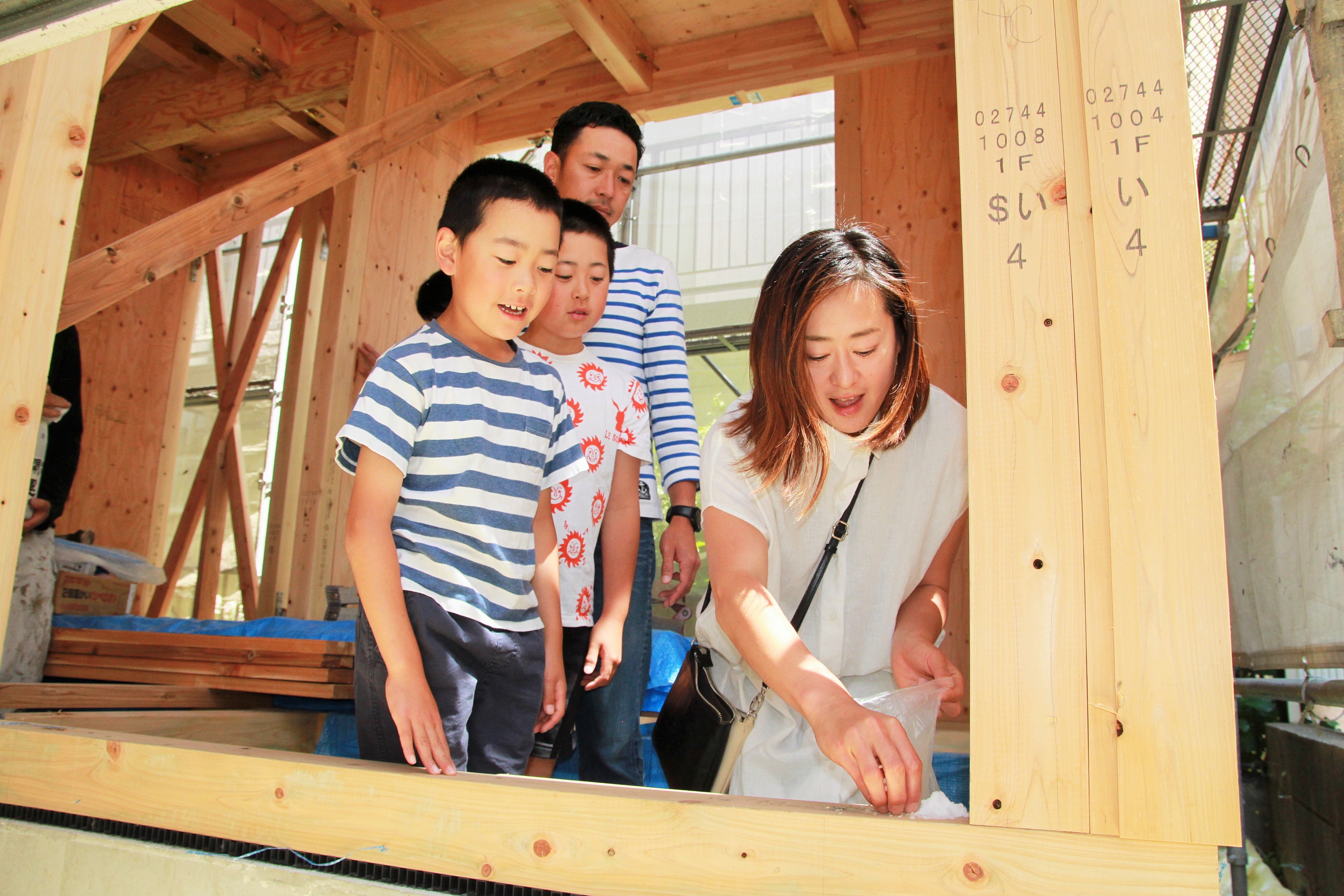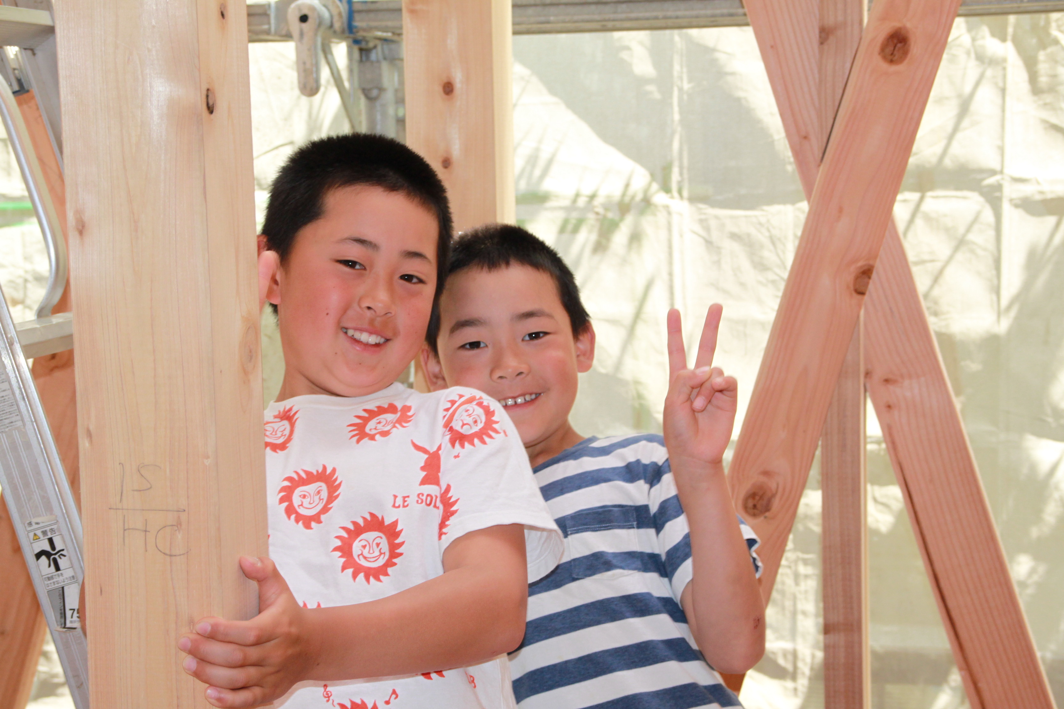 ご家族が到着されました。上棟したばかりの家に、お子様たちも興味津々。この瞬間しか見ることの出来ない建物の構造です。いい思い出になります様に!