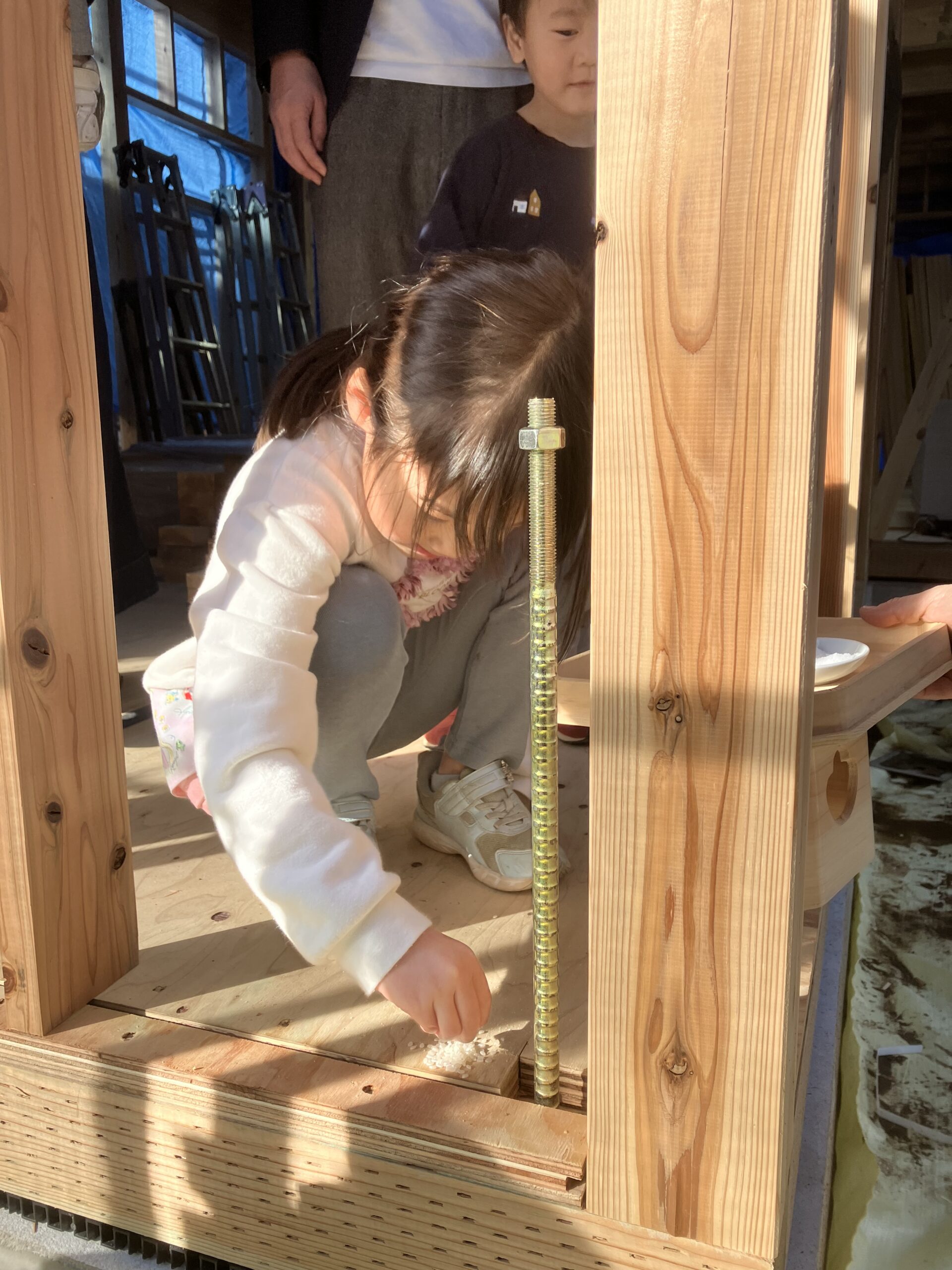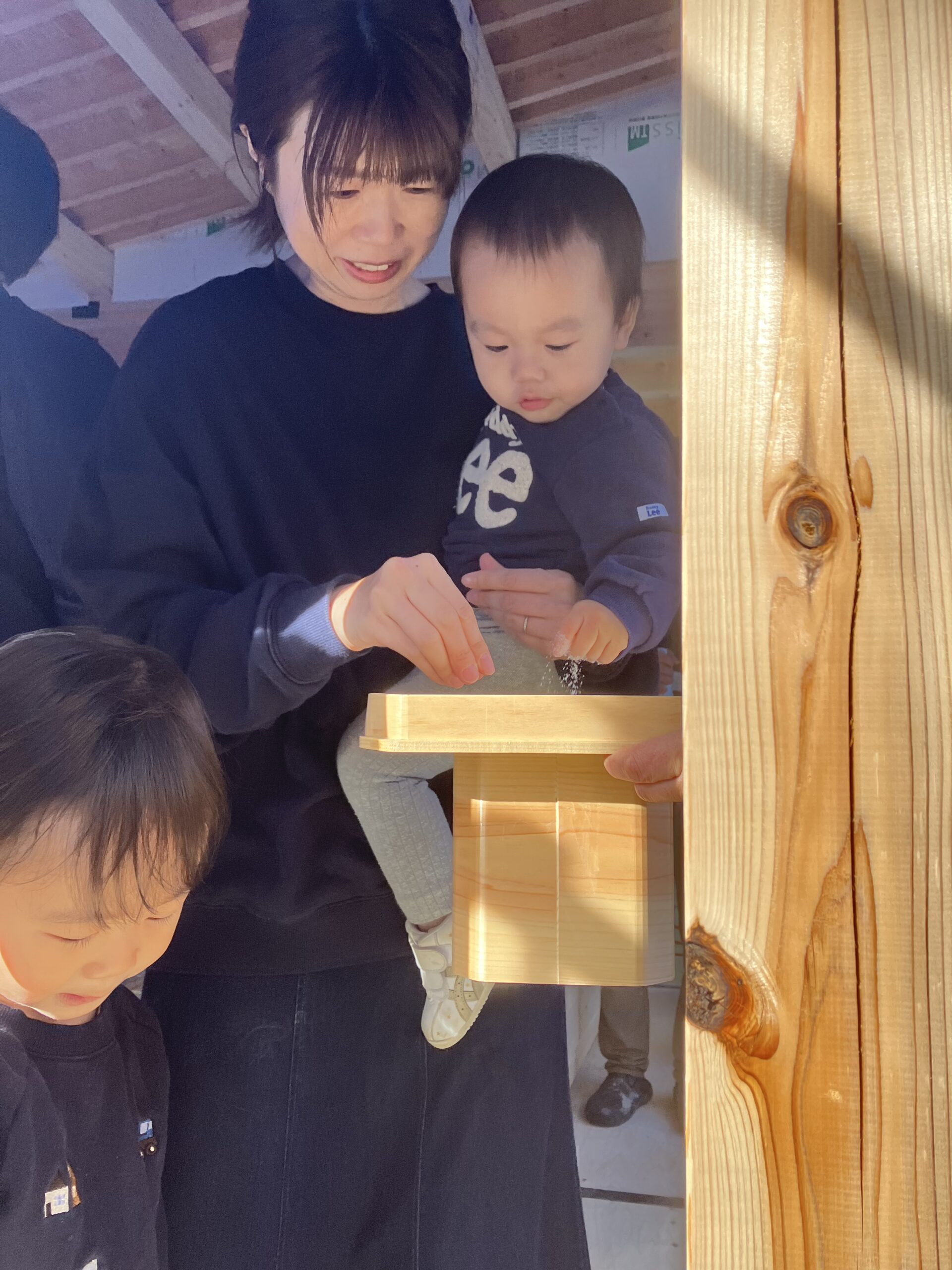 可愛くて元気な3人きょうだいの長女ちゃんがお塩とお米をそっとつまんで丁寧にお清め。