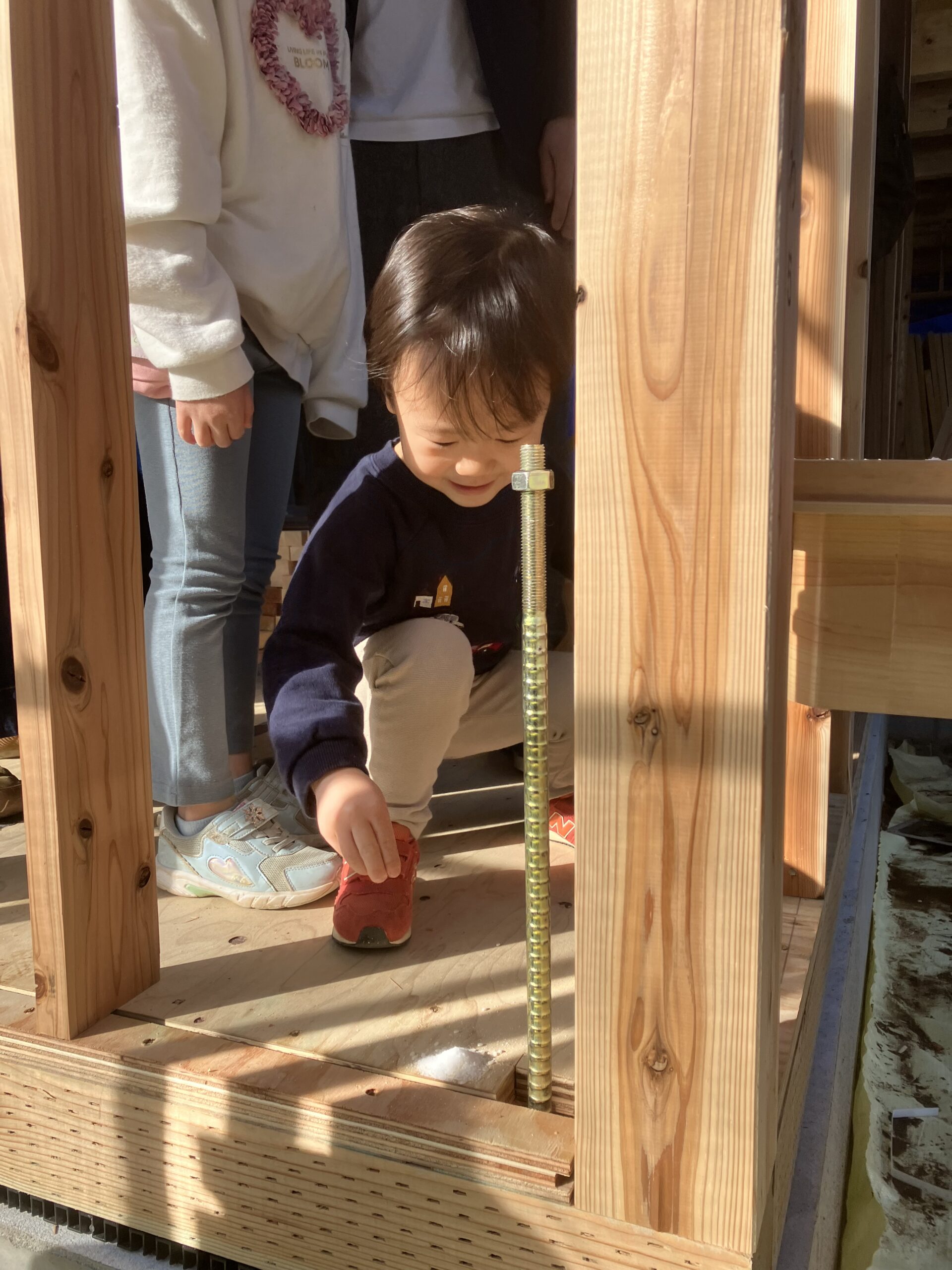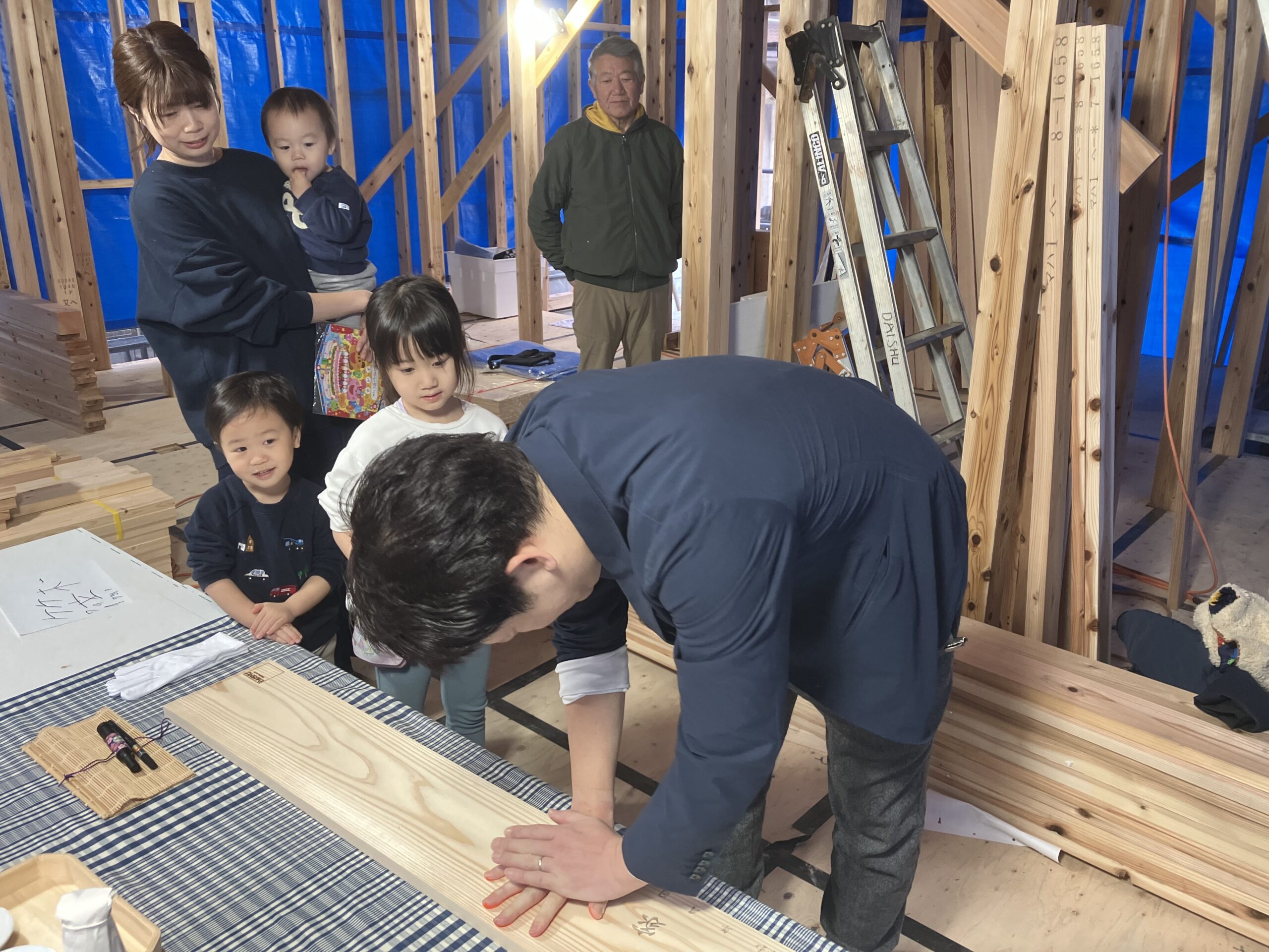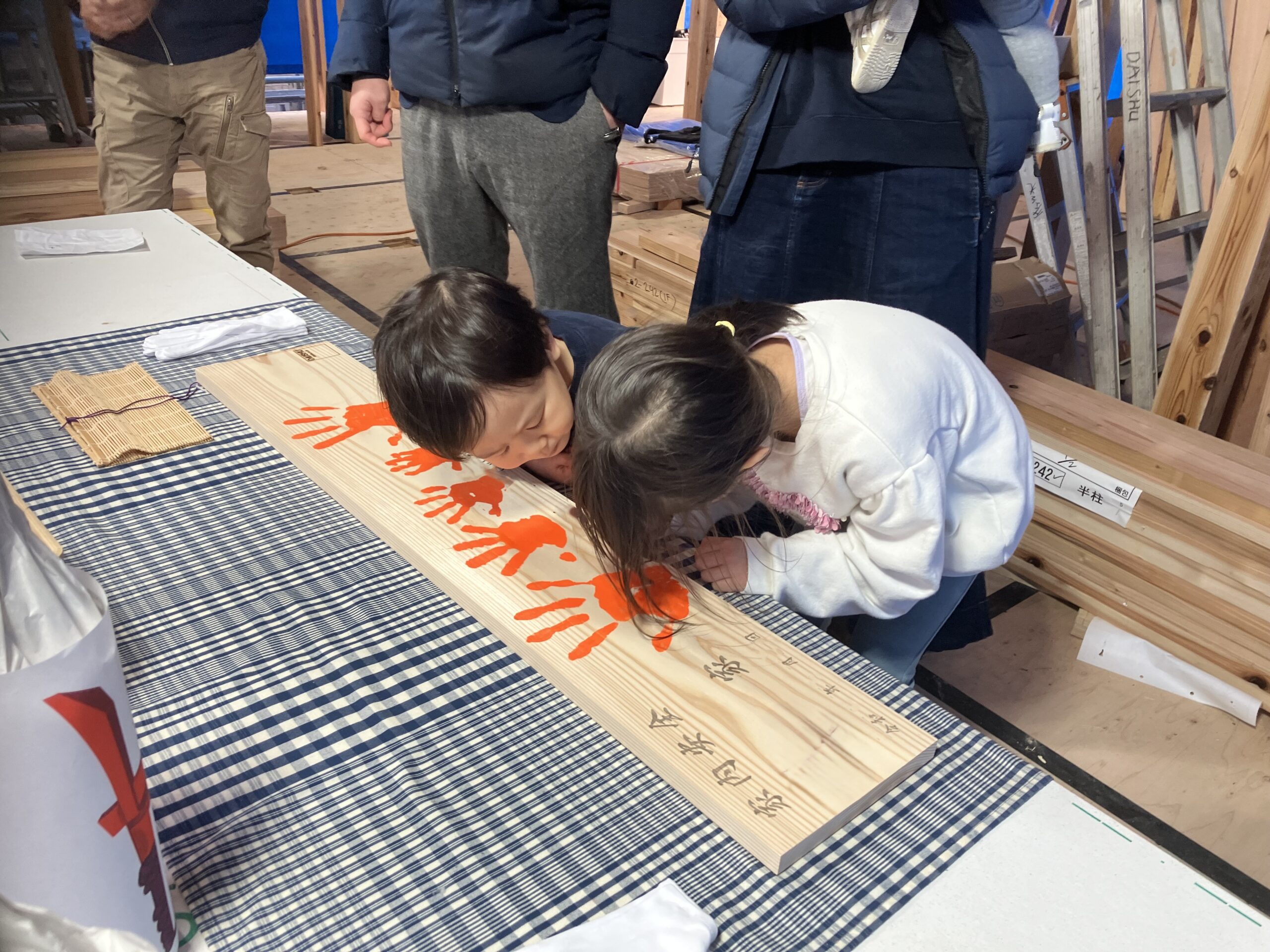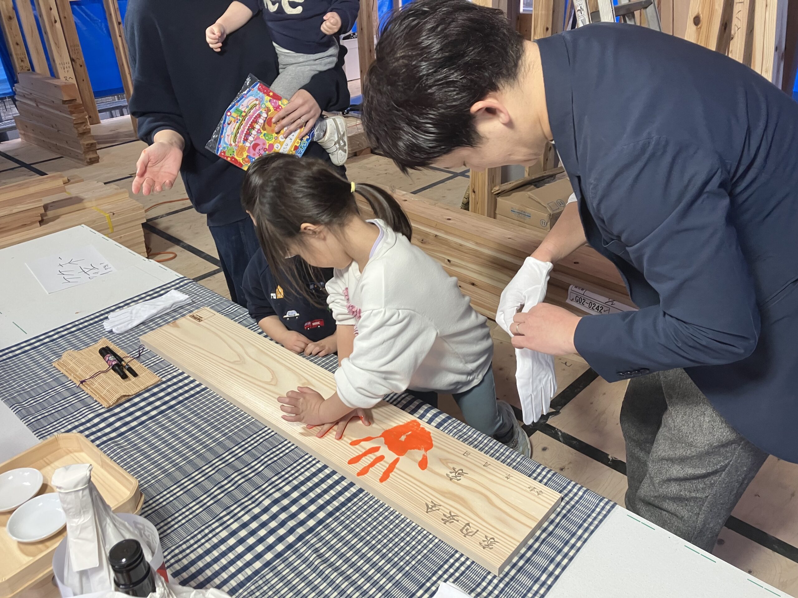 手形式の楽しそうなお姿に、プランご相談の際、3人のお子様が家で遊ぶのが大好きになる家、本にいつでも触れられて、勉強もみんなで並んでできる家をとおっしゃっていたのを思い出し、あたたかな気持ちになりました。