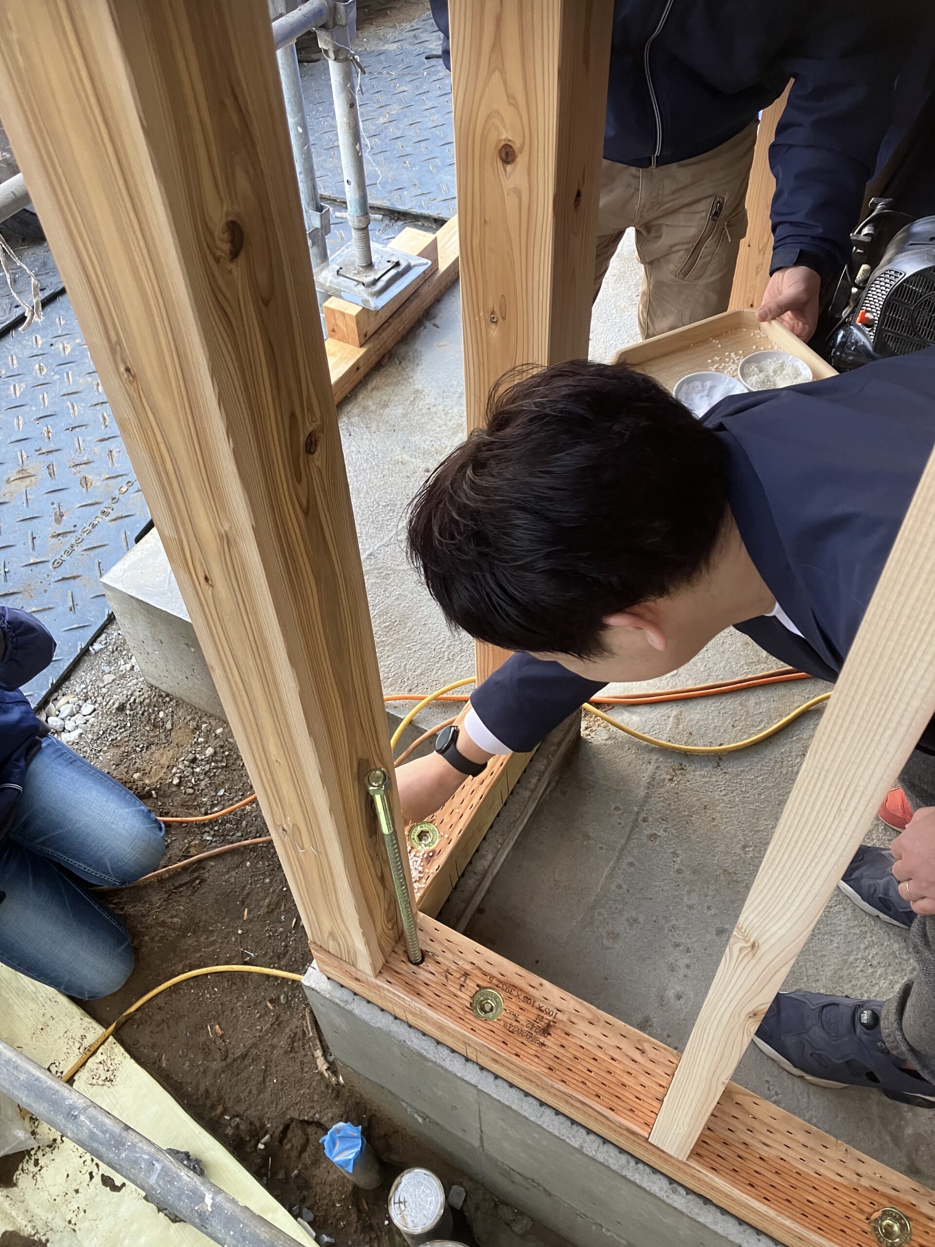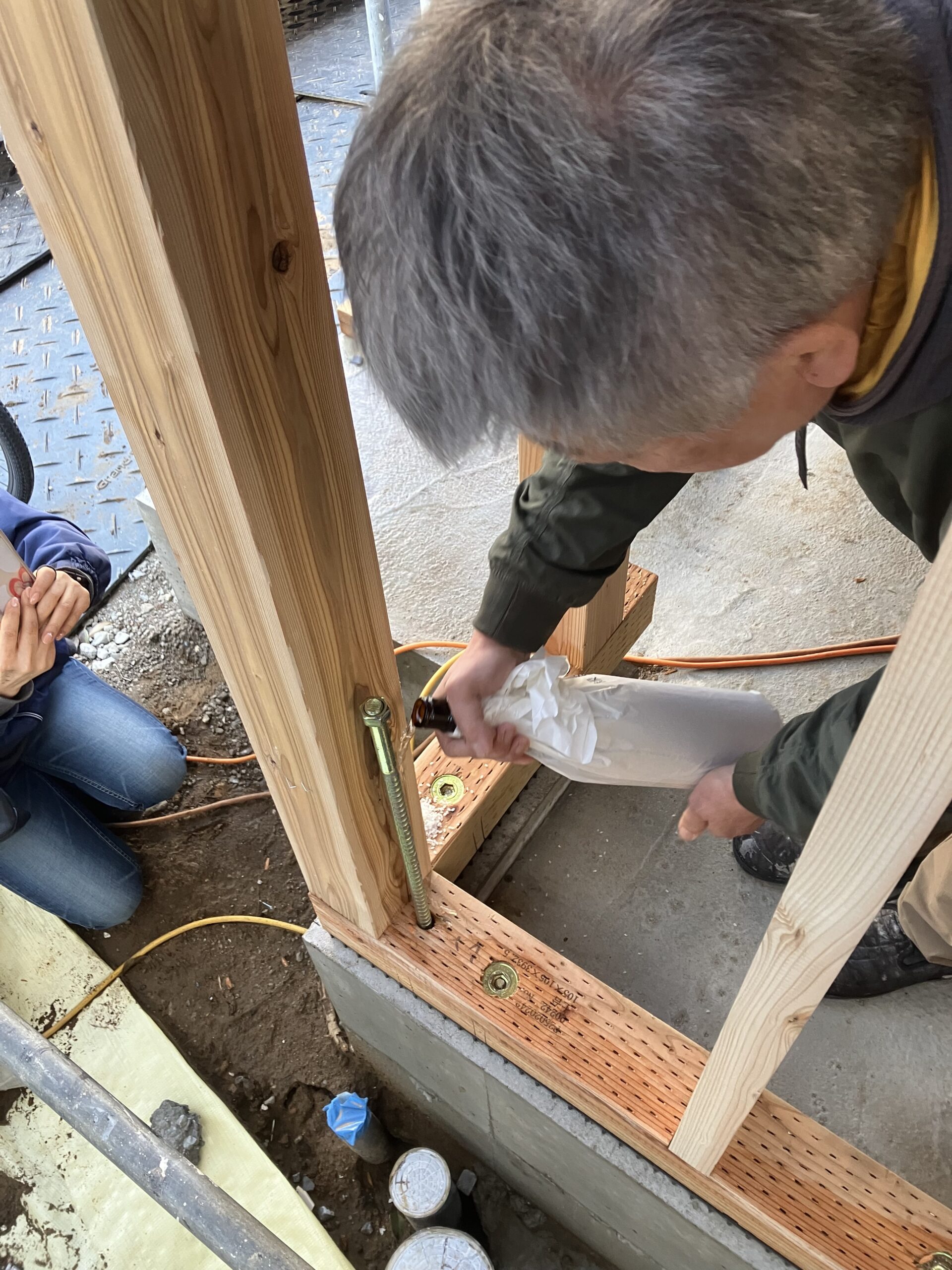 手形式の前に、無事建物が完成することを願い、米と塩、お酒で建物の四方をお清めします。