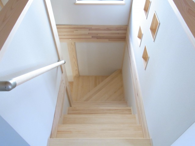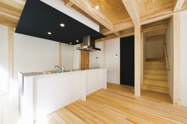 本北方の家は、国産材をふんだんに使い、内部は現しの構造体、1階はキッチンとLDKの一体感、2階は現しの吹き抜けとなっており、とても住み心地の良い建物となっております。